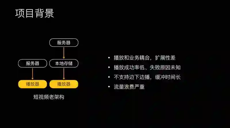 技术上,之前也只是做很基础的架构,直接由播放器连接服务器下载数据,达到能播放就可以。之前我们没有积极去做这个事情,导致播放成功率低、失败原因未知、不支持边下边播、缓冲时间比较长等问题,流量浪费也比较严重。