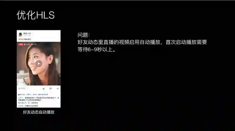在优化视频播放过程中,我们在 4 月份也做直播。直播这里面插入个事情,我们要播放直播的视频流,是 HLS 的视频,在好友动态里面可以观看直播的内容。HLS 在安卓上面体验非常差,因为安卓 3.0 之后对 HLS 基本没有做的优化工作,这里每次安卓上播放 HLS 需要等待 6-9 秒。