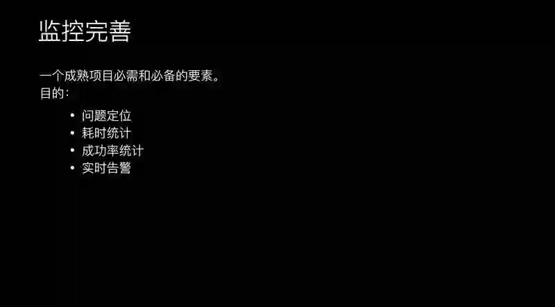 在告警方面,基于成功率和失败率的统计,进行实时告警。一出现错误码,微信立即可以收到提醒,提醒说是什么原因导致这次告警,完全全自动。