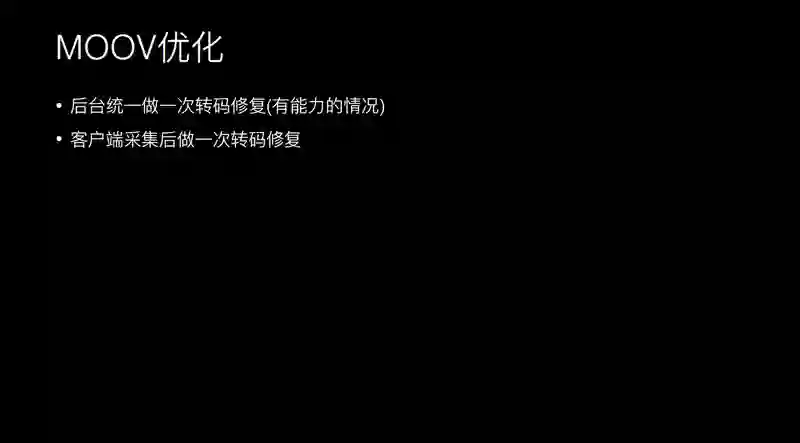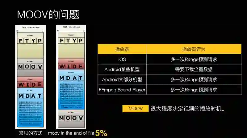 对于 iOS 来说,一开始把头部下载了,找不到 MOOV,就猜测 MOOV 在尾部,多一次 Range 请求去探测 MOOV 到底在哪?基本做法是去尾部探测, 如果 MOOV 在其他地方的话,这次播放肯定是失败的。安卓某些手机如果没有经过处理,MOOV 在尾部的情况下需要下载整个视频才能开始播放。