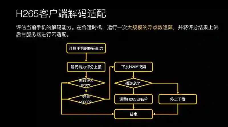 为了解决如何在我们手机上能够解码的问题,对手机的解码能力做一次评估。我在合适的时机做一次大规模的浮点数运算,将数据上传到后台服务器进行云适配。如果当前的指数满足 H.265 条件的话,可以给你下载 H.265 视频给你播放。从而保证软件解码柔性可用,针对视频源规格按机型适配降级,保证用户视频播放体验。