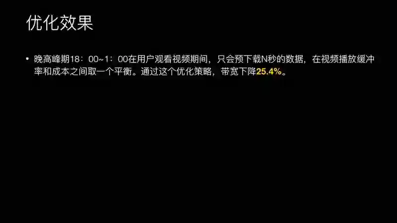 上线这个策略之后,对带宽的优化还是比较明显的。在高峰期时从 18:00 到凌晨 1 点带宽下降 25.4%,这个是我们不断灰度最终确定的值。这个值会影响播放缓冲,因为数据少的话必定会卡顿,在卡顿之间和流量之间取了一个最优值,最终是 25.4%。