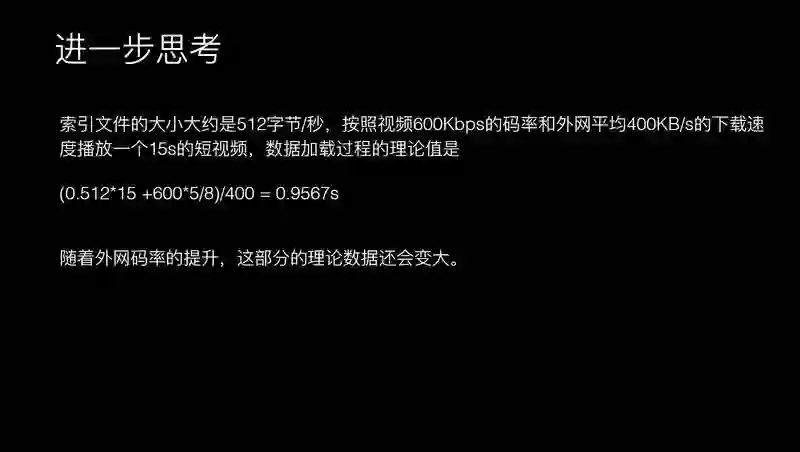 进一步思考,按照普遍 600K 码率的话,我们统计到现在 APP 上面下载的平均速度是 400K 左右,这样计算的话,可能在安卓上面播放一个视频的话,需要将近 0.9 秒左右才可以下载到你需要的数据。
