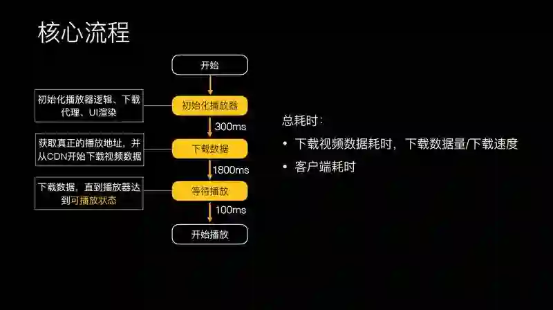 这里主要有两个大的耗时点,第一下载视频数据耗时;第二个是客户端的耗时,下载视频数据耗时的话,主要是下载数据量和下载的速度。