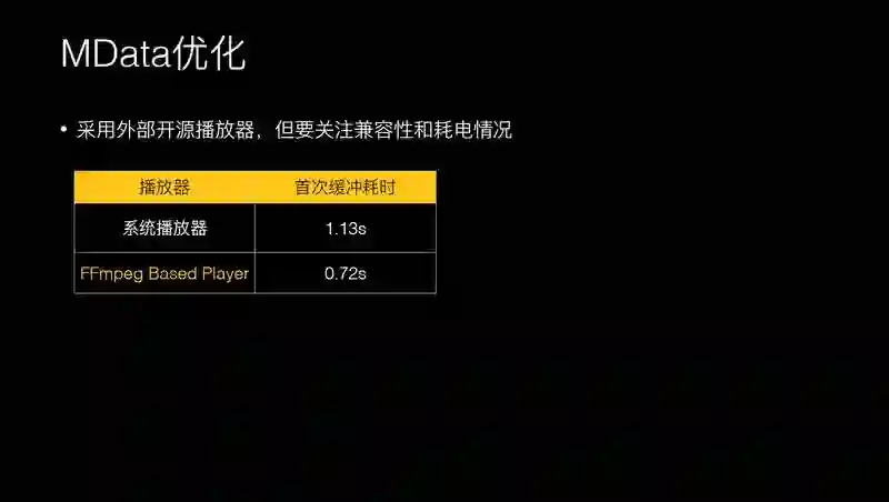如果需要下载 5 秒数据才可以播的话,肯定是非常慢的。我们这里的策略会采用 FFmpeg Based Player 自己来做解码,要关注兼容性和耗电的问题。解决了 Mdata 之后,如果 MOOV 数据在头部,拿关键信息进行播放的话,其实需要的开始播放数据量是非常小的。