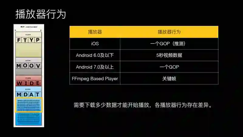 需要下载多少数据才能播呢?每个播放器的行为也不一样。iOS 要下载一个完整的 GOP 才可以播。像 FFmpeg Based Player 的话只需要关键帧就可以播出来。安卓是比较尴尬的一个系统,在 6.0 及以下,需要下载 5 秒视频数据才可以播起来。
