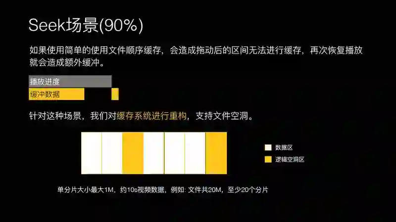 针对 Seek 场景,用户拖动,如果文件缓存系统是顺序存储系统的话,必然会造成拖到这里时,后面的缓存数据没有办法下载到系统里面来。只要用户每次拖动,拖动后的下载数据没法存到硬盘上来。