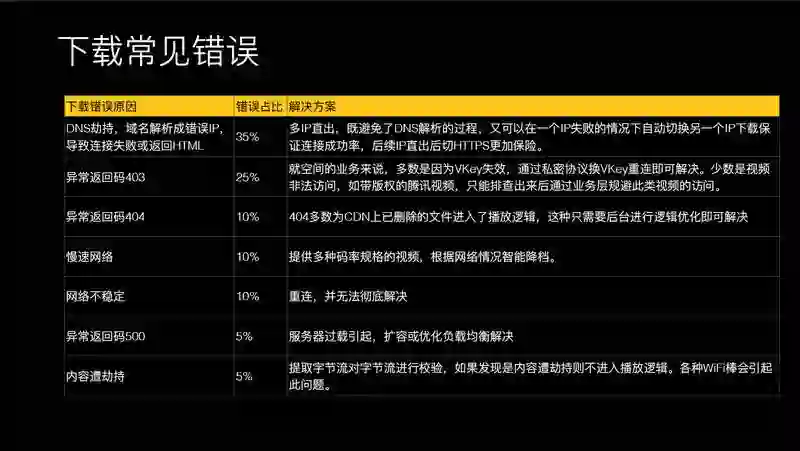 DNS 劫持是比较多的,会劫持你的请求。这个是在国内比较常见的劫持,有的小运营商按 URL 劫持视频内容,可能直接污染 DNS 让你查找不到 CDN,这是比较多的,还有一些网络不稳定的影响导致。更高级的直接污染视频内容,让视频内容是错误的。