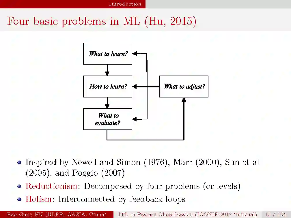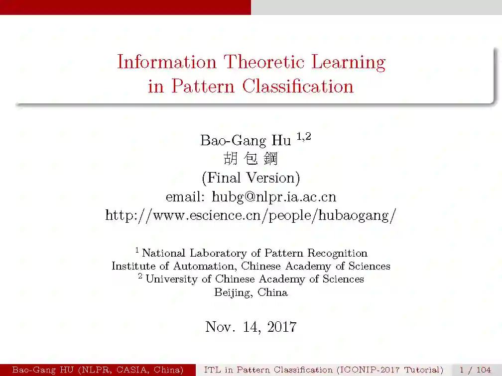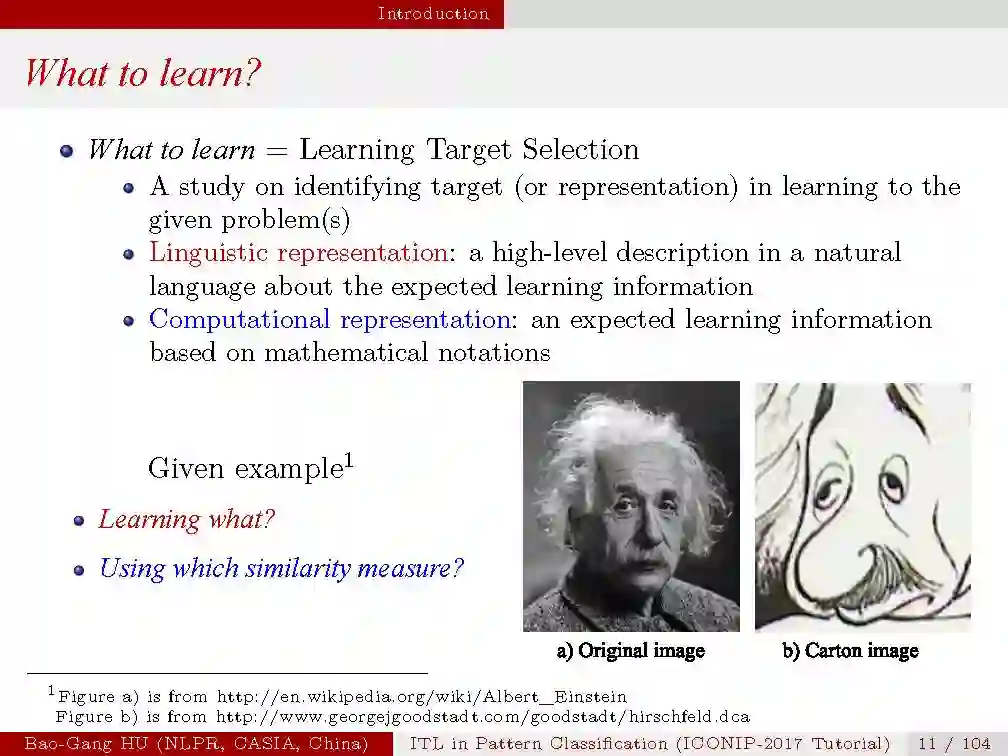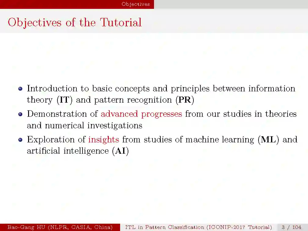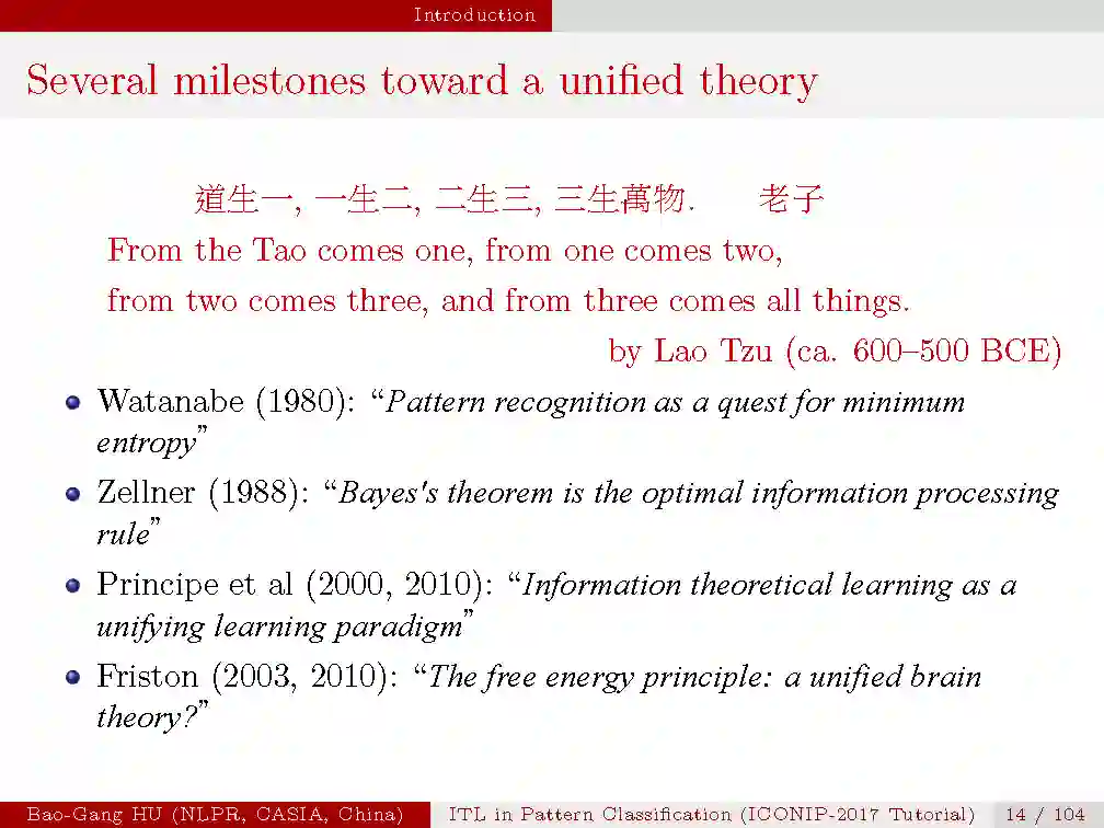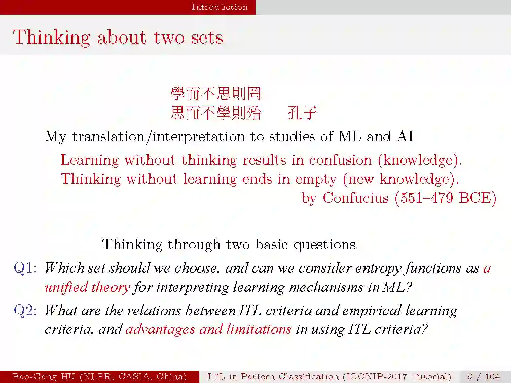 本次tutorial的目的是,1.介绍信息学习理论与模式识别的基本概念与原理;2.揭示最新的理论研究进展;3.从机器学习与人工智能的研究中启发思索。由于时间有限,本次只是大概介绍一下本次tutorial的内容,后续会详细介绍每一部分。