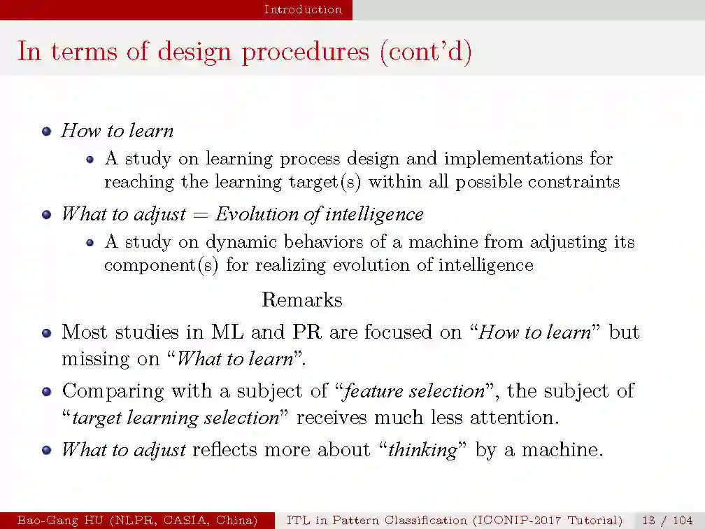 在大部分的机器学习与模式识别研究中,关注更多的是”how to learn”与”what to evaluate”的问题,但是”what to learn”以及”how to adjust”的问题却很少被研究,而他们也是机器学习更加智能的关键,如果学习目标是错误的,即使再好的学习方法也无法达到目标;而不知道如何调整机器学习组件,也就无法提升机器智能的层次。