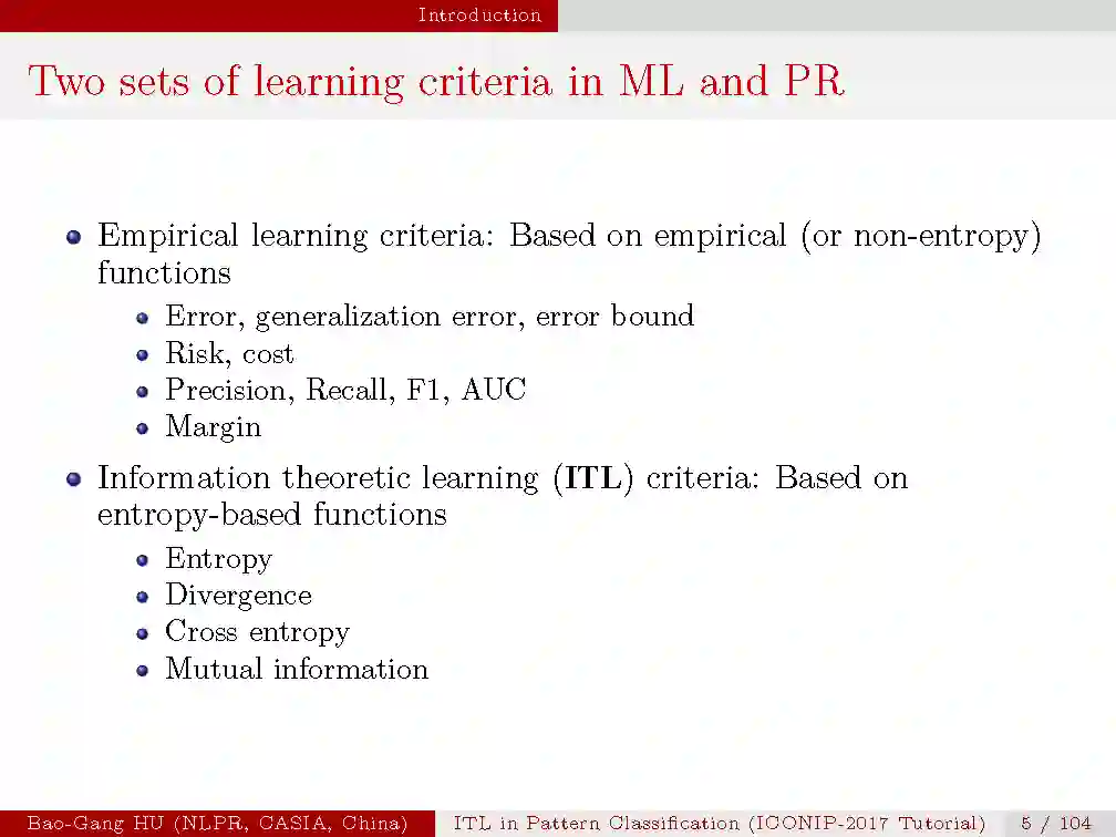 在机器学习中,经验学习准则一般基于经验函数,如误差、泛化误差、误差边界、风险、损失、准确率、召回率等;而信息学习理论准则通常是基于熵的函数,如信息熵、信息散度、交叉熵、互信息等。