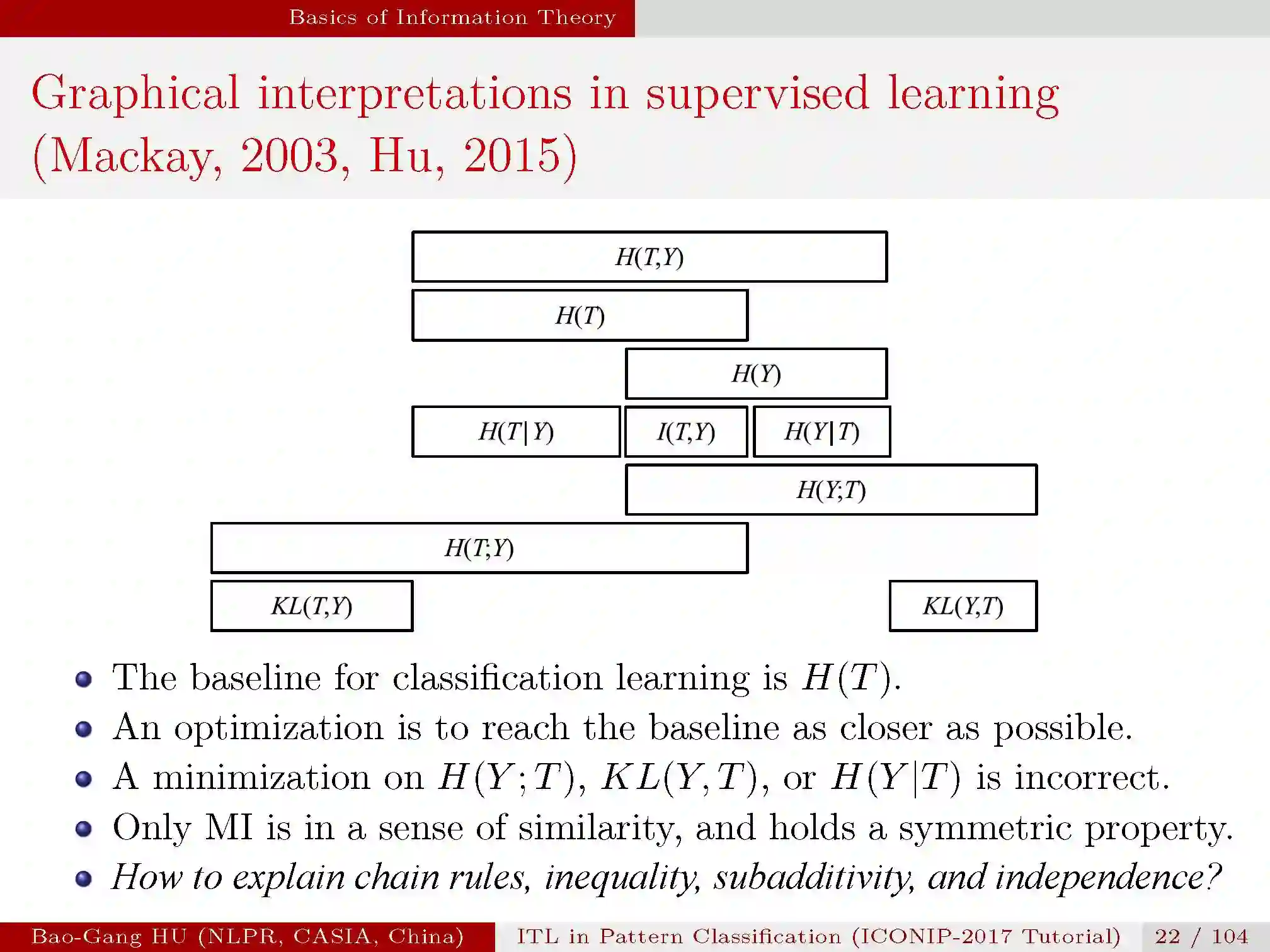 在上图中,监督学习中信息度量的图式理解,这个图很重要,T表示目标变量,H(T)是分类问题的基线;优化算法优化目标尽可能接近这个基线,但是直接优化交叉熵H(Y;T),KL散度,条件熵并不一定能达到目的。只有互信息作为一种相似性的度量,拥有对称的属性。