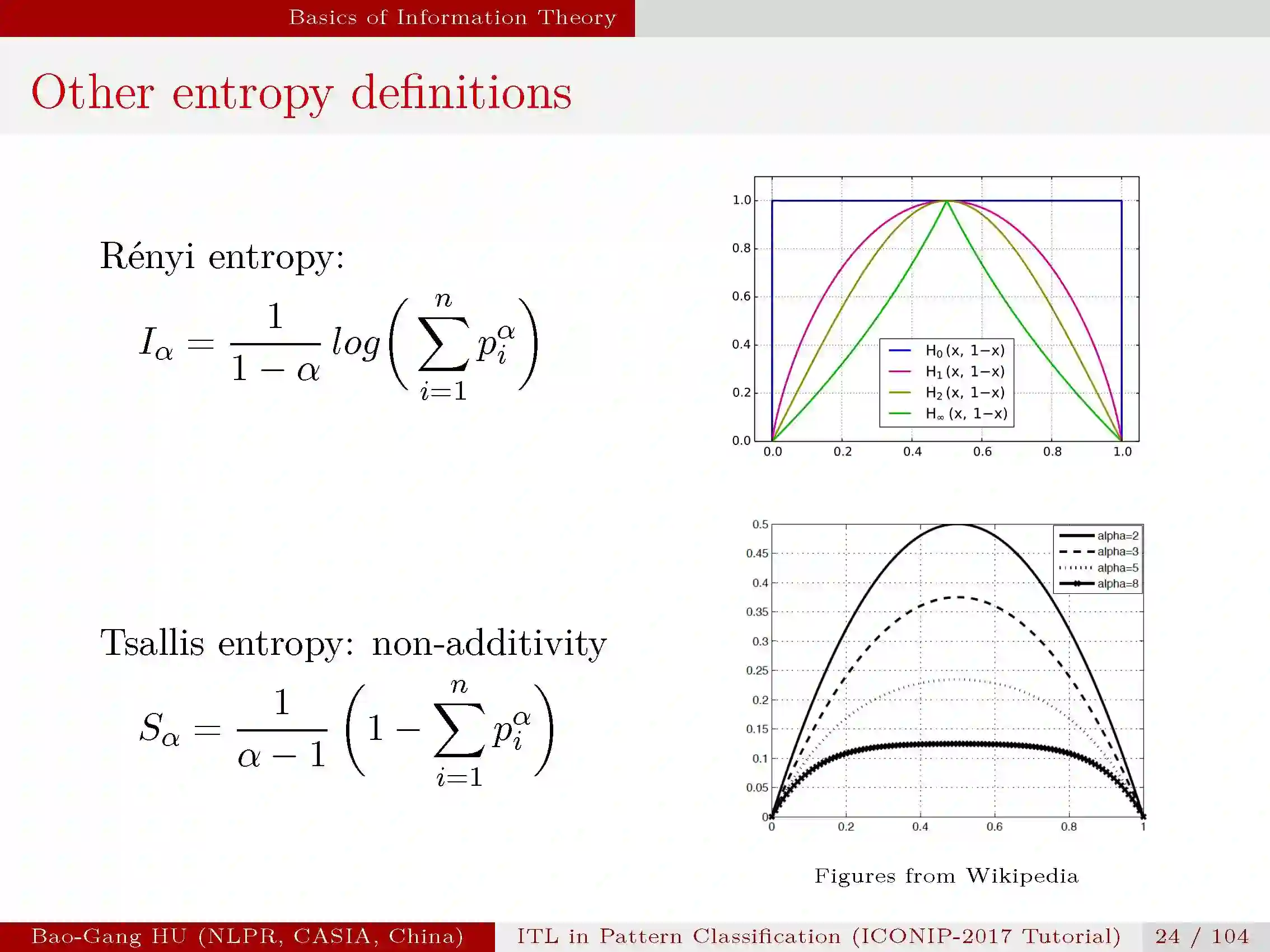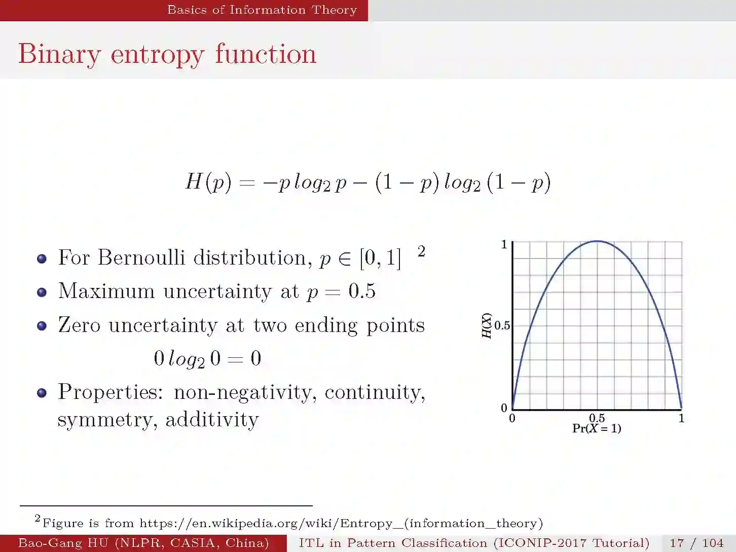 在这一部分,首先介绍熵的概念,它是随机变量不确定度的度量。如下,香农熵的计算形式,二值熵函数。