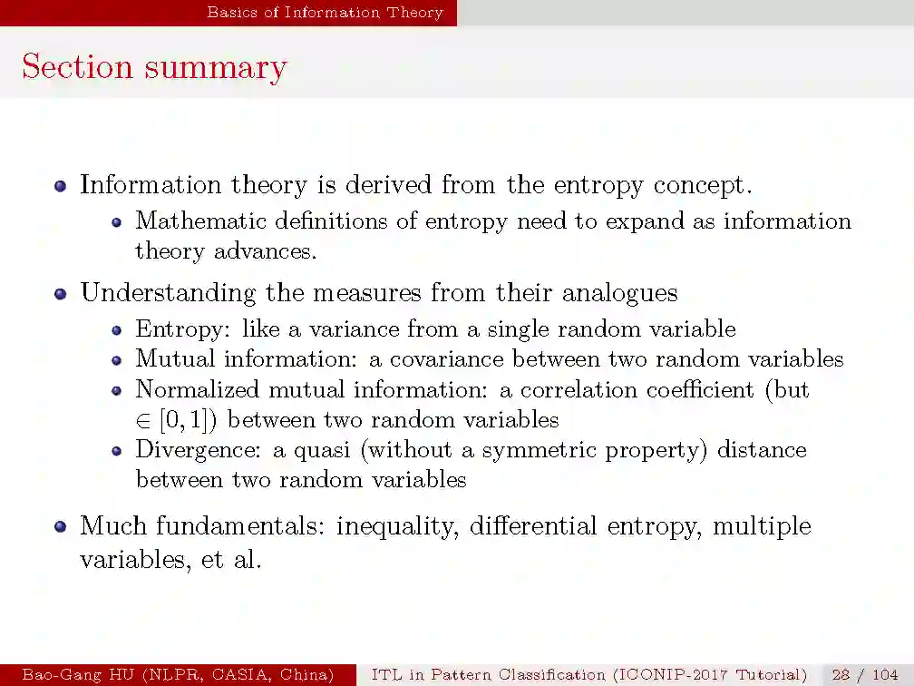 信息论源自于熵的概念,熵的数学定义形式会随着信息论的发展不断拓展;如果我们用类比的方式理解信息度量,比如,熵看作单一随机变量的偏差;互信息看作两个随机变量的协方差;归一化的互信息看作两个随机变量的相关系数;散度看作两个随机变量的一种距离度量。可以从中得到许多启发。