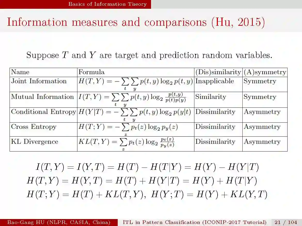 为了回答,作者对比了信息学习理论与机器学习的联系与差别,以分类学习为例,希望读者理解信息论目标或准则的重要发展趋势及其独特优点,如拒识分类中能够实现代价缺失学习。讲座中用图形方式解释了这些准则(如KL散度,交叉熵,互信息之间)之间的关联,以及局限性(如KL(T,Y)=0,不意味着两类样本的等同)。
