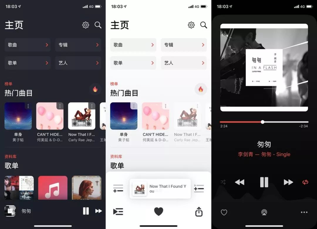 作为首个 Apple Music 第三方客户端,Soor 在上周也算是一个爆款了。最亮眼的莫过于全新设计的 UI 和配色,它将原本混杂在五个标签页下的 Apple Music 进行拆解重组,以单屏瀑布流的形式展现在一页之中,你可以根据自身需求选择性展示订阅内容。而深灰和深黑的配色方案,让你在大晚上听歌的时候不至于被亮瞎眼。手势下拉开启的全局搜索与拖拽操作,则让你可以更为便捷地调节播放列表。