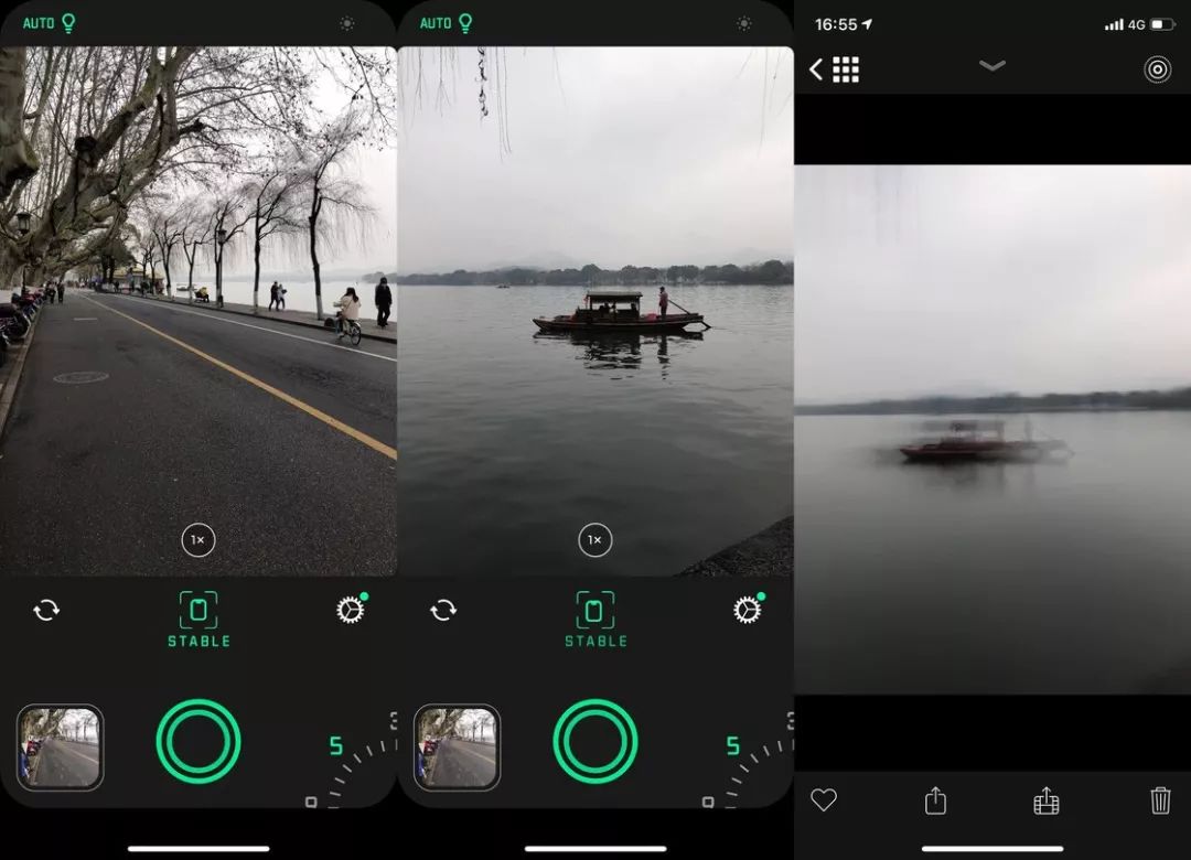 Spectre 的拍摄方式与原生相机基本没有区别,点击取景框调节对焦,右侧滑杆调节亮度,唯一增加的调节项就是右下角滚轮调节的曝光时间,设置完成后点击底部快门可以开始长曝光创作。借助于算法,应用会自动消除轻微抖动造成的虚影和长时间曝光对亮度的影响,无论是华丽的光规,还是连绵的流水,都可以轻松拍摄出来。此外,应用还会将曝光过程以 Live Photos 的形式保存下载,为你的作品提供另外一种展现形式。