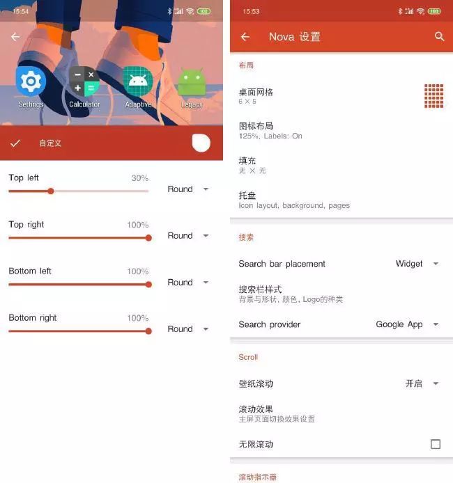 另一方面,随着自适应图标(Adaptive Icons)的引入,我们在装点主屏时需要考虑的细节也更多了。试想一下,当你把图标统一设定成了圆角矩形,装着不少应用图标的文件夹却依然是默认的圆形……Nova Launcher 6.0 不仅正式支持了文件夹图标和应用图标的形状关联,应用抽屉中的搜索栏样式也能像主屏搜索栏那样进行自定义了。
