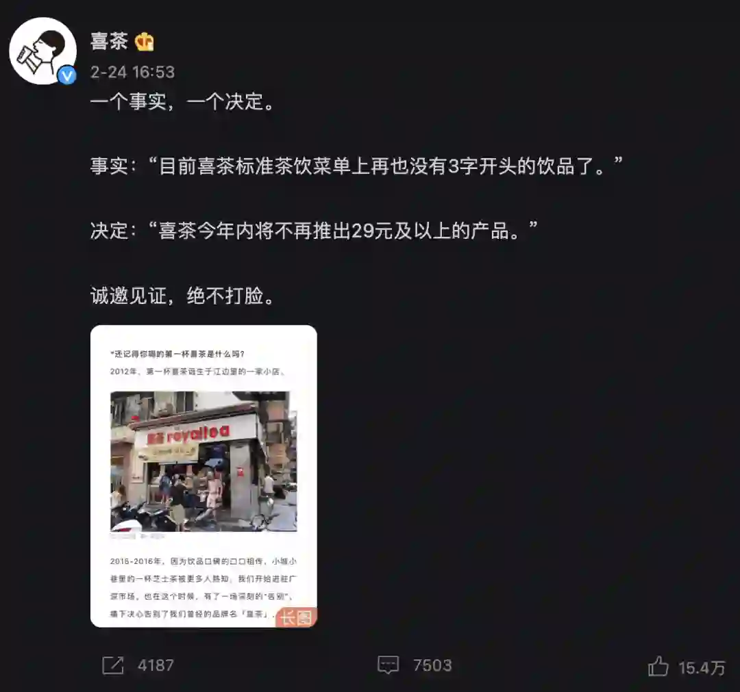2022年2月,以高端形象深入人心的喜茶宣布降价,并表示:“喜茶今年内将不再推出29元及以上的产品”。3月,奈雪的茶官宣降价,推出亲民系列的同时对30元以上产品价格进行下调,“奈雪大幅降价10元”一度登上微博热搜榜前列。