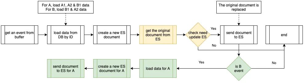 下面的流程图显示了由事件处理器执行的程序。其中包括公共处理器流程(白色),以及针对对象 B 事件的附加过程(绿色)。当通过从数据库中加载的数据创建一个新的 Elasticsearch 文档时,它会从 Elasticsearch 获取原始文档,比较是否有更改字段,并决定是否需要向 Elasticsearch 发送新文档。