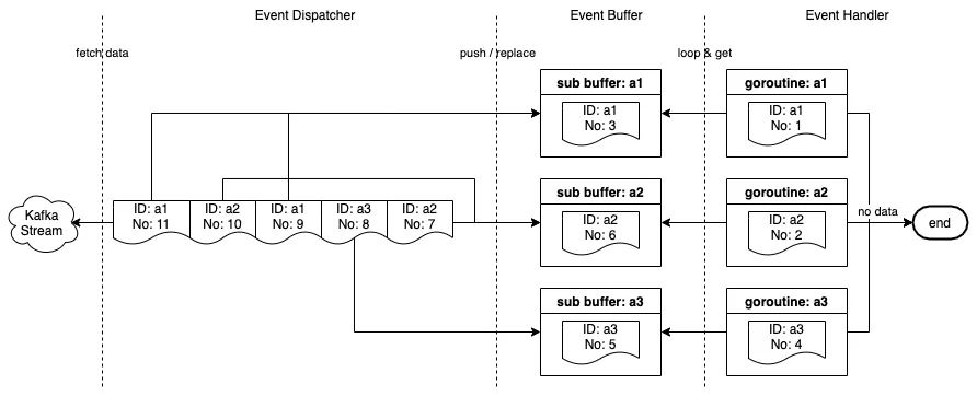 事件缓冲区(Event Buffer):事件通过主键(aID、bID 等)缓存在内存中。一个事件被缓存在缓冲区中,直到它被一个 goroutine 选中,或者当一个具有相同主键的新事件被推入缓冲区时被替换。