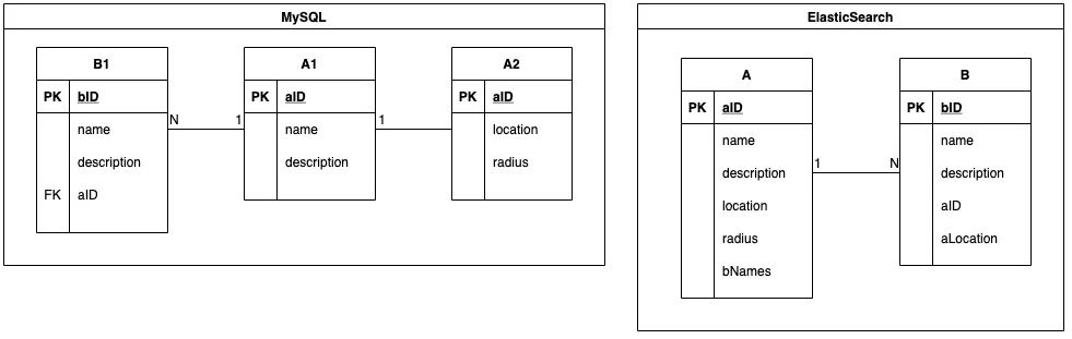 Elasticsearch 中的索引与 MySQL 表对应。MySQL 的数据存储在表中,而 Elasticsearch 的数据则存储在索引中。多个 MySQL 表被连接起来,形成一个 Elasticsearch 索引。以下代码段展示了 MySQL 和 Elasticsearch 中的实体 - 关系映射。实体 A 与实体 B 有一对多的关系。实体 A 在 MySQL 中有多个相关的表,即表 A1 和 A2,它们被连接成一个 Elasticsearch 索引 A。