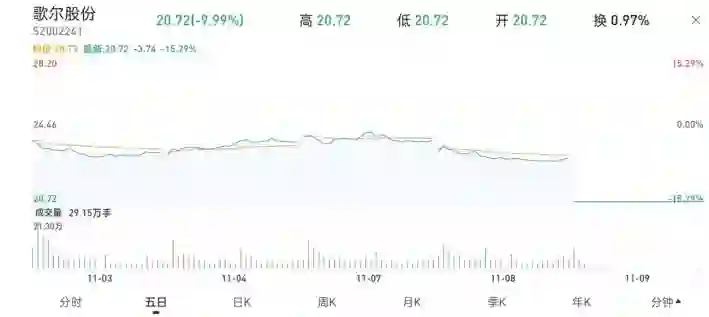 11月9日早间,果链白马股歌尔股份,开盘即跌停,一日内市值蒸发近80亿,封单超300万手,仍有巨额资金在排队逃出。