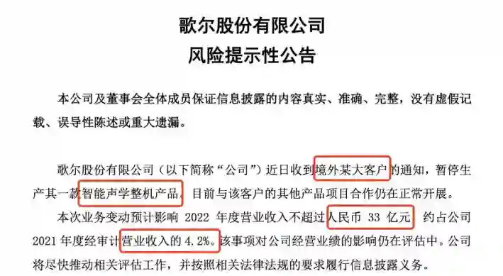 11月8日晚,歌尔股份发布风险提示性公告称:“ 近日收到境外某大客户的通知,暂停生产其一款智能声学整机产品。”
