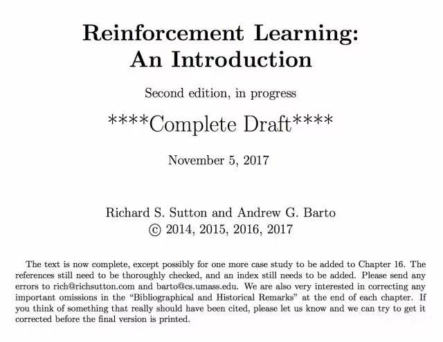 萨顿:第二版的完整草稿目前已经可以在richsutton.com上看到。Andy Barto和我正在定稿:验证所有的参考文献,诸如此类。印刷版将于明年初发行。