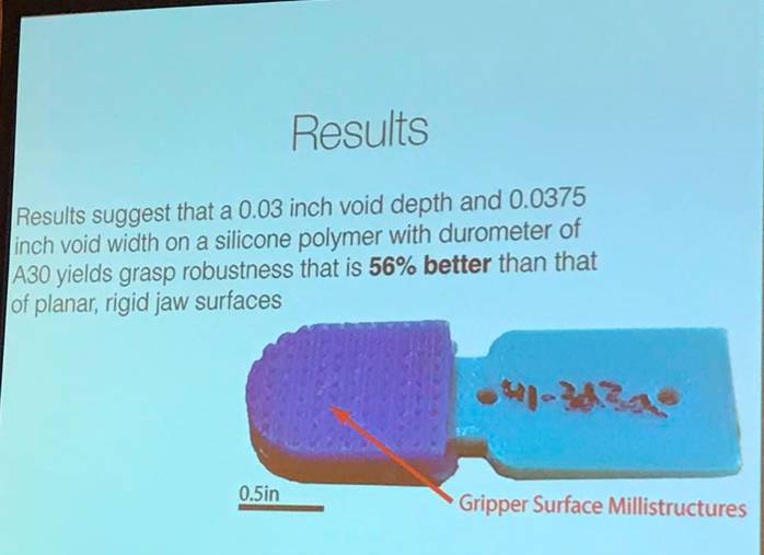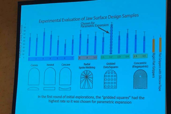 郭梦龙从小在加拿大和美国长大,因此先前和 AI 科技评论交流的时候,他的普通话说得并不标准,但在 workshop 的时候,他用非常流利的英语充满自信地分享了他所做的研究工作——《基于鲁棒抓取的平行机械爪尖设计》。
