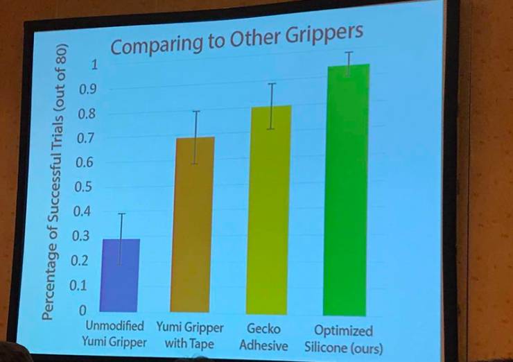 而在讨论环节中,郭梦龙经常被问到这样一个问题,「为什么会选择从硬件层面入手改善机械爪」,而这也和他个人的研究方向有关。郭梦龙从事的研究和制造比较相关,他认为从算法层面提高机械爪抓取效果一来已经被研究得很多,二来也与他偏硬件的研究方向不太契合,因此采取了这种另辟蹊径的方式进行尝试。