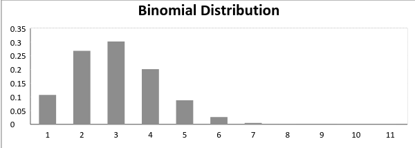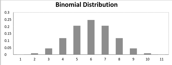 现在,当成功的概率 = 失败的概率时,二项分布图如下