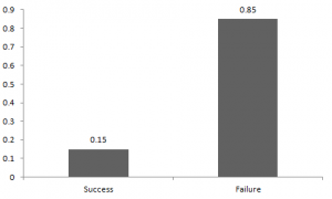 成功与失败的概率不一定相等。这里,成功的概率(p)与失败的概率不同。所以,下图显示了我们之间比赛结果的伯努利分布。