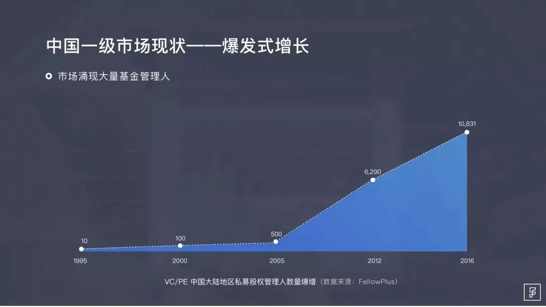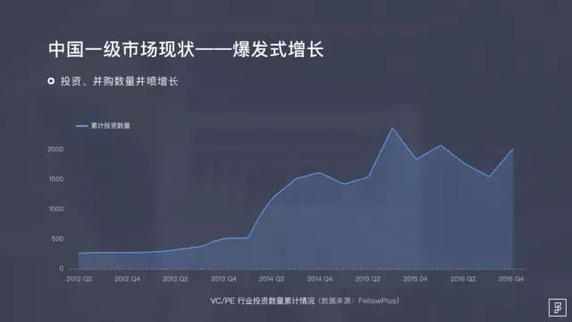 首先中国的一级市场,现状是爆发式的增长。主要体现在两个方面,一方面是投资并购的数量呈现井喷式增长,另一方面,是市场涌现了大量基金管理人。