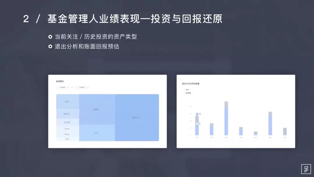 在这里会出现一个很大的问题,基金管理人的甄别的需求会大大提升。所以我们其实为了这块,做了充分的准备,通过我们的数据和自己团队的专业分析,实现了对市场上乎所有的融资机构和投资人的业绩还原,以及基于业绩和数据所形成的人脉影响力的还原。比方说在业绩还原这一块不仅仅会关注到 IR 的情况,或者说退出的情况,我们还会分析投资和退出的一些特点,比方说有没有比较高的行业集中度,或者在行业上下游上有没有一些偏好之类的。