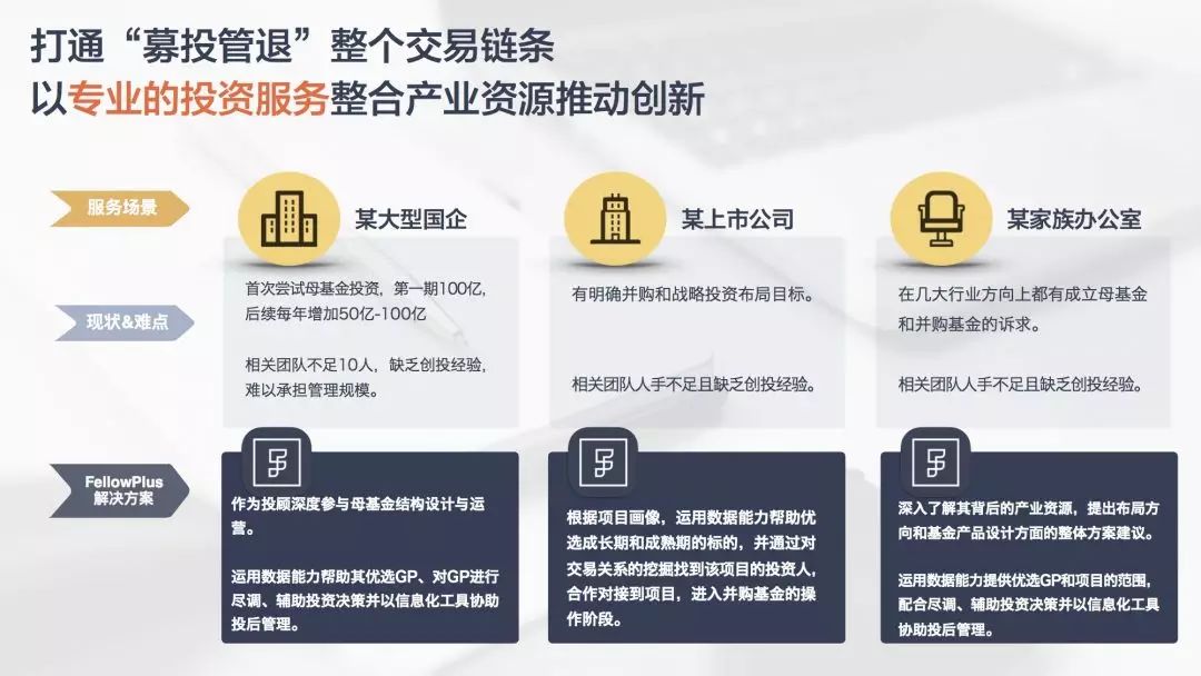 这是 FellowPlus 现在正在做的几个服务场景,我们希望通过这个方式打通“募投管退”的交易链,以专业的投资服务去整合产业资源来推动创新。我们可以看到,比方说国企、上市公司和家族办公室,当然这个背后其实都有真实的案例,但是因为 confidential 的原因,我们不能告诉各位具体是谁。因为今天有很多朋友探讨到商业化的问题,所以想在这个地方跟大家分享一点点 FellowPlus 所做的尝试。谢谢大家。