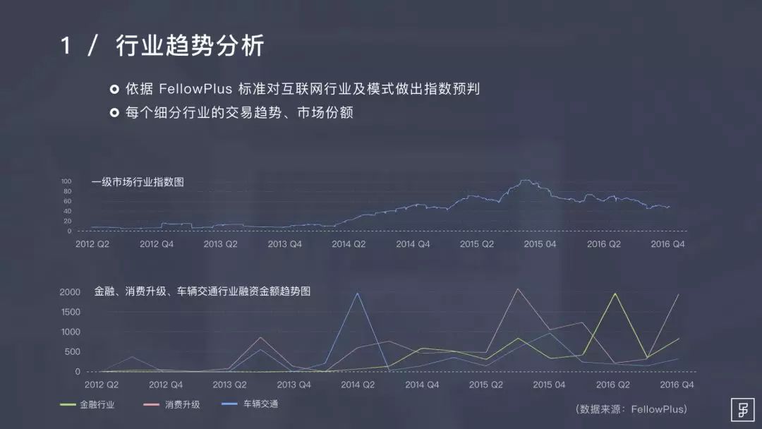我们在做行业趋势分析这个产品的过程中,带有很多做 VC 的思路在里头。我们依靠 FellowPlus 标准,对互联网行业以及模式做出指数性的预判。第二个是我们在每个细分行业的交易趋势和市场份额上面,做了一些收集,因为在做这个产品之前,产品负责人跟我非常深度地探讨了一下,究竟投资人是怎么去判断一个行业的趋势,我跟他讲了非常多做投资的故事。举个最简单的例子,比方说我以前是投资电子商务行业的,对于这个行业来说,你想知道很多实际的交易情况,比如一些公司的营业额、利润是非常困难的。作为一个投资人,我希望能够找到这个行业的价值洼地,就是那些运营能力极强,但是在市场上因为品牌力弱而被低估的一些公司,有没有可能用我们的数据库去找到这样的投资标的。有了这样的想法之后,我们就按照一种数据的方式实现出来,这是我们内部研究产品的一种方法论。