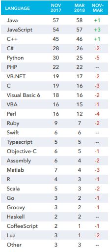 再一次,Java 和 JavaScript 引领企业使用率。它们的年龄使其自身具有可信度,拥有许多可供选择的工具和框架,以及丰富的学习资料。