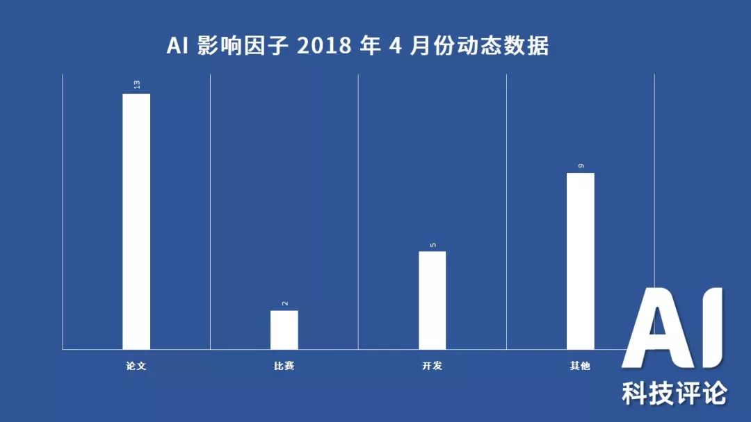 根据「AI 影响因子」数据库显示,2018 年 4 月份国内企业研究院发布论文 13 篇,比赛获得冠军事件 2 起,开发类事件 5 起,其他 AI 领域影响事件(成立实验室、人事变动、独家专访等) 9 起。