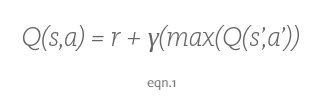 首先我们初始化矩阵(上文所述的 16×5 表格)为零矩阵,然后根据不同动作所获得的奖励更新矩阵的元素。当然,更新该矩阵的方法为计算贝尔曼方程(Bellman Equation):
