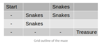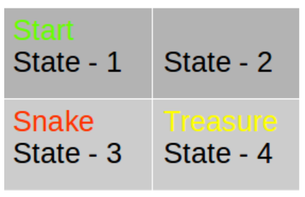 该游戏从一个给定的位置开始,即初始状态(starting state)。在每一个状态下训练实体都可以保留原地或选择向上、下、左、右移动,但不能穿越迷宫的边界。每个动作都将使得训练实体进入不同的单元格(即不同的状态)。现在在某个单元格有一个宝箱(即目标状态)。此外,迷宫的某些位置/状态有蛇。因此训练实体的目标就是通过寻找一条没有蛇的路径从起始状态走到目标状态。