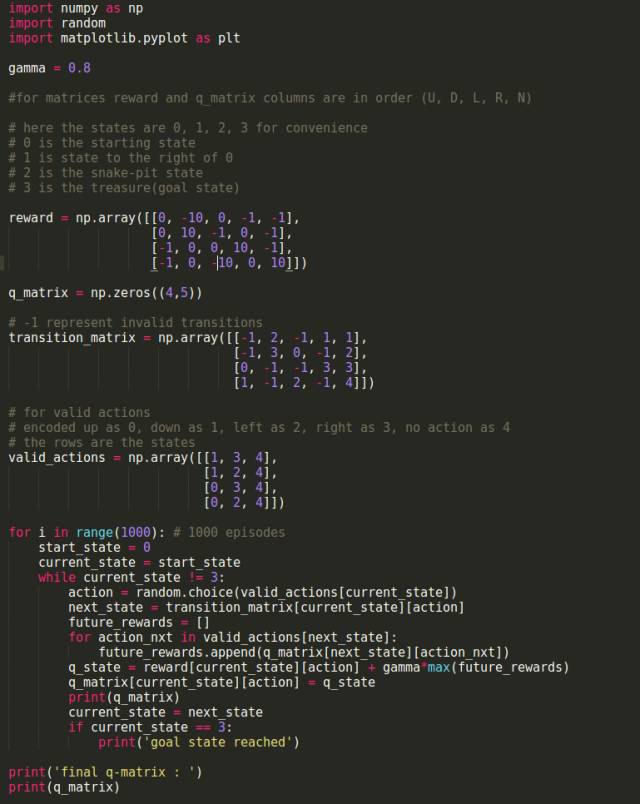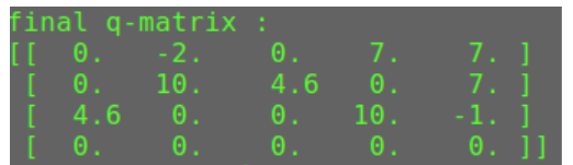 所以,现在训练主体到达目标状态 4。接下来终止该进程,并进行更多的训练直到训练主体理解了所有状态和动作,且所有的 Q 矩阵元素成为常数。这也就意味为训练主体已经尝试了所有的状态-动作对。