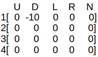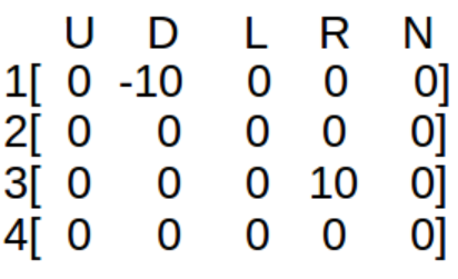 其中,因为 Q 矩阵还没有更新,max(Q(3,U) & Q(3,R)) = 0。设定设定踩上蛇的奖励为-10。现在新的 Q 矩阵的值就如下所示: