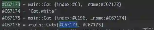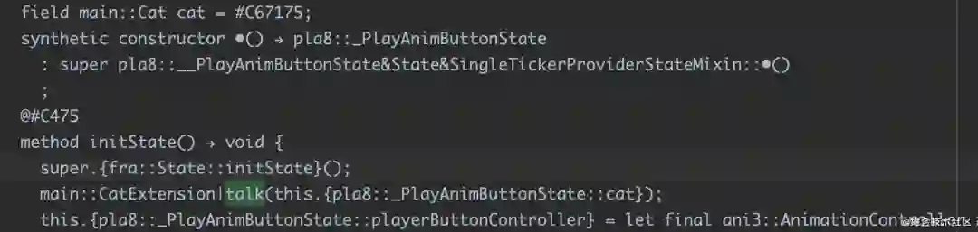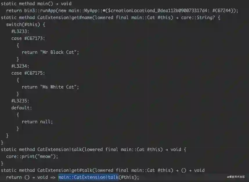 如下图所示,在 Cat 的使用处,编译后可以看到 cat.talk() 其实就是执行了 main::CatExtension|talk。