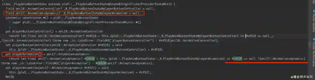 如下图所示,通过提取编译后的代码,可以看到 playerAnimation 其实被转变成了 Animation? 的可空对象,而当 playerAnimation 被调用时,通过 get playerAnimation() 进行判断,如果此时 playerAnimation == null,直接就抛出 LateError 错误。