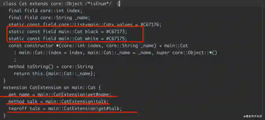 如下图所示,编译后 Cat 里的枚举值对应变成了一个 static final 的固定地址,并且 CatExtension 里的 talk 和 value 也被指向了新的位置。