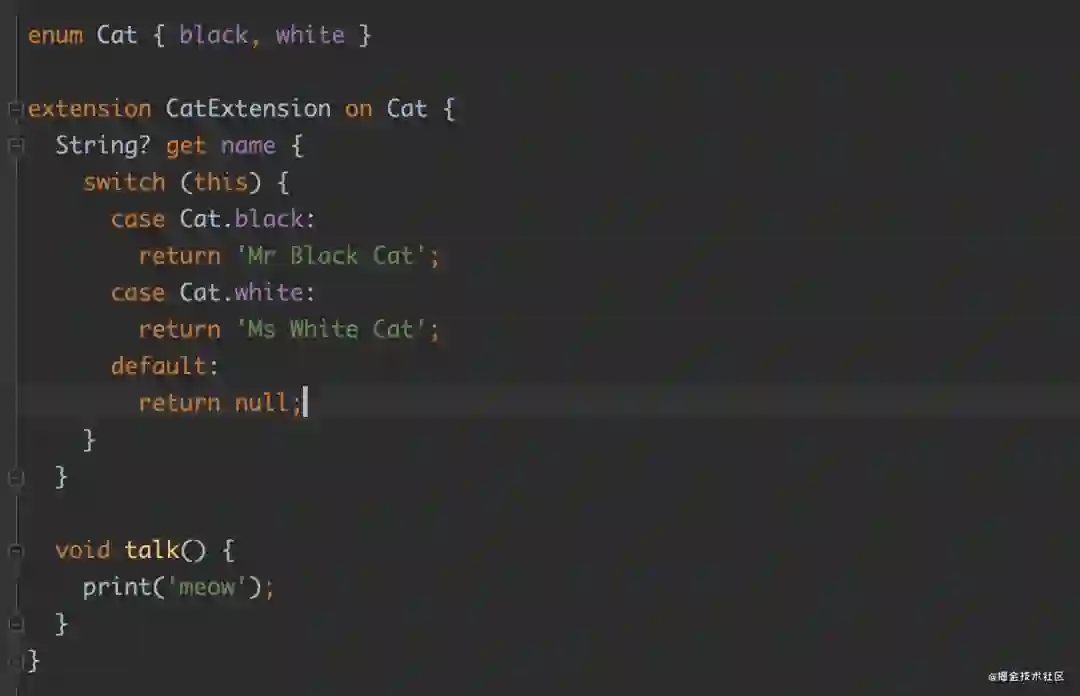 如下图所示,我们声明了一个 Cat 的枚举,并且对 Cat 进行了拓展,从而为枚举的每个值赋值,并且加了 talk 方法。