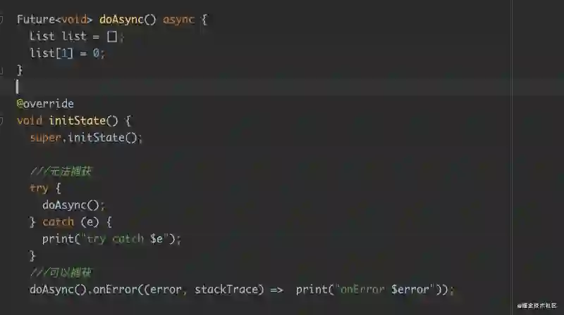 这也是为什么我们在外部对一个 Future 进行 try catch 不能捕获异常的原因,所以如下图所示,对于 Future 需要通过 .onError((error, stackTrace) => null) 的方式来对异常进行捕获处理。