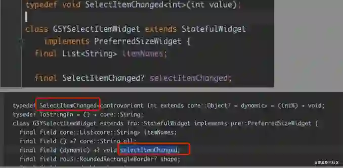 再举个例子,如下图所示,可以看到通过 SelectItemChanged 声明的 selectItemChanged,在编译后其实直接就是 final field (dynamic) →? void selectItemChanged; 。