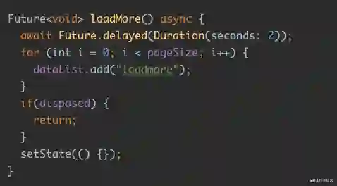 可以看到,loadmore 方法在编译后被添加了很多的代码,其中定义了一个 _Future<void> async_future 并在最后返回,同时我们需要执行的代码被包装到 async_op 里去执行,而这里有一个很关键的地方就是,async_op 对执行的内容进行了 try catch 的操作,并通过 _completeOnAsyncError 返回。